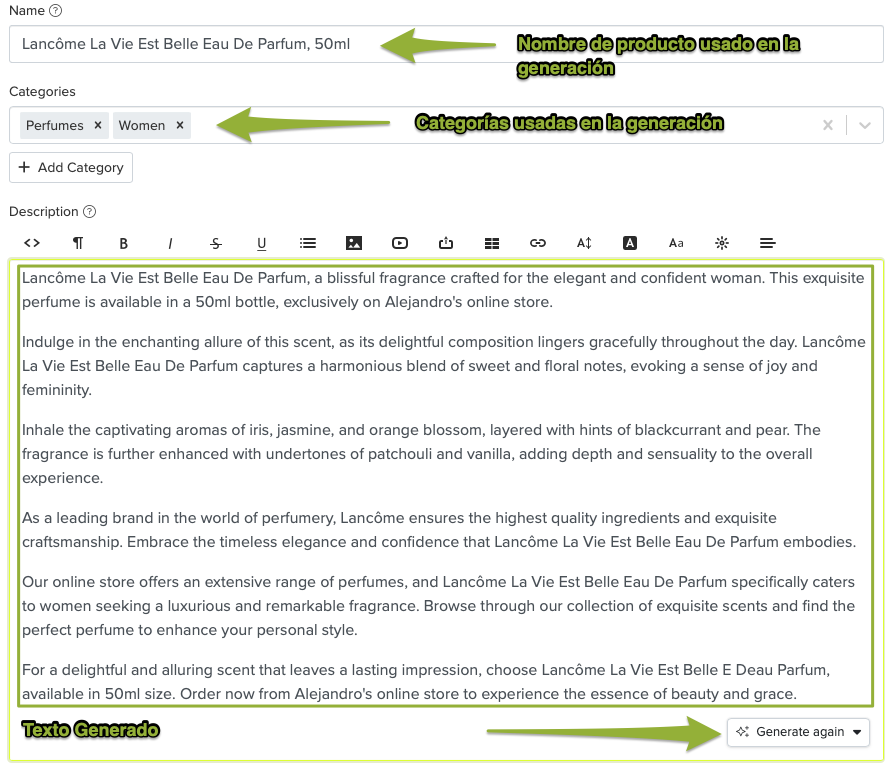 Además de estas mejoras, nuestra plataforma aprovecha el poder de la IA para agilizar el proceso de elaboración de descripciones de productos atractivas, únicas y optimizadas para SEO. Basada en Chat GPT, nuestra tecnología de IA generativa toma información básica sobre tu producto, como su nombre, categorías y una breve descripción, y utiliza esto para generar descripciones dinámicas y atractivas. Esta funcionalidad está disponible a partir del plan Pro.
